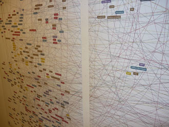 The final artwork was a series of 4 A0 posters that ‘visualised’ Ken’s text (an essay he had written for the Embedded Art catalogue) as a network of connections. It also worked as a reflection of Ken’s process and essence as a writer, connecting what may seem like random “historical events, cultural allusions and epistemological shifts” in an impressive complete story with fascinating insight. The artwork is the result of a true and highly enjoyable collaboration, moving back and forth between Ken and myself. Ken covers the